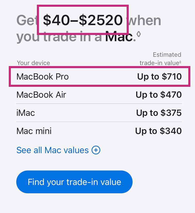 Az Apple korábban például a MacBook Pro modelleket 760 dolláros áron kínálta, majd ezt 2515 dollárra emelte. A MacRumors megjegyezte, hogy ez reálisabb, hiszen például egy használt M3 Max processzoros MacBook Pro 16” csúcsmodell esetén még így is durva a bukás mértéke. Aztán az Apple pár órával később az „up to $2515” értéket módosította 710 dollárra. A szépen táblázatba gyűjtött cikk ekkor összeomlott, hiszen nem hogy emelve nem lett a beszámítási érték, de még a korábbi alacsony árnál is alacsonyabb lett.