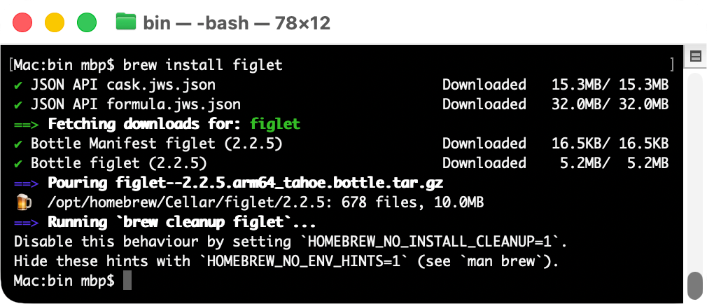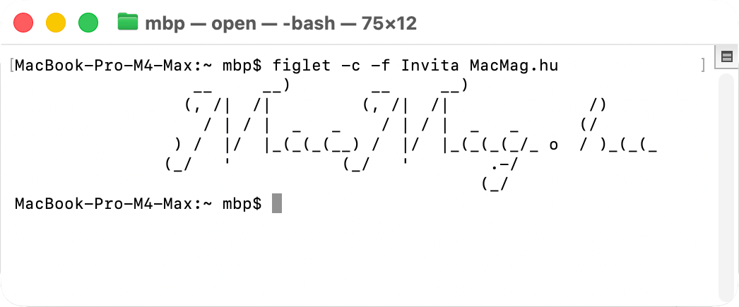A dolog úgy működik, hogy a brew install figlet parancsot követően a kicsiny alkalmazás letöltődik, telepítődik a Terminal felületén, majd ezt követően a figlet parancs után bármilyen tetszőleges szöveg kiírható.