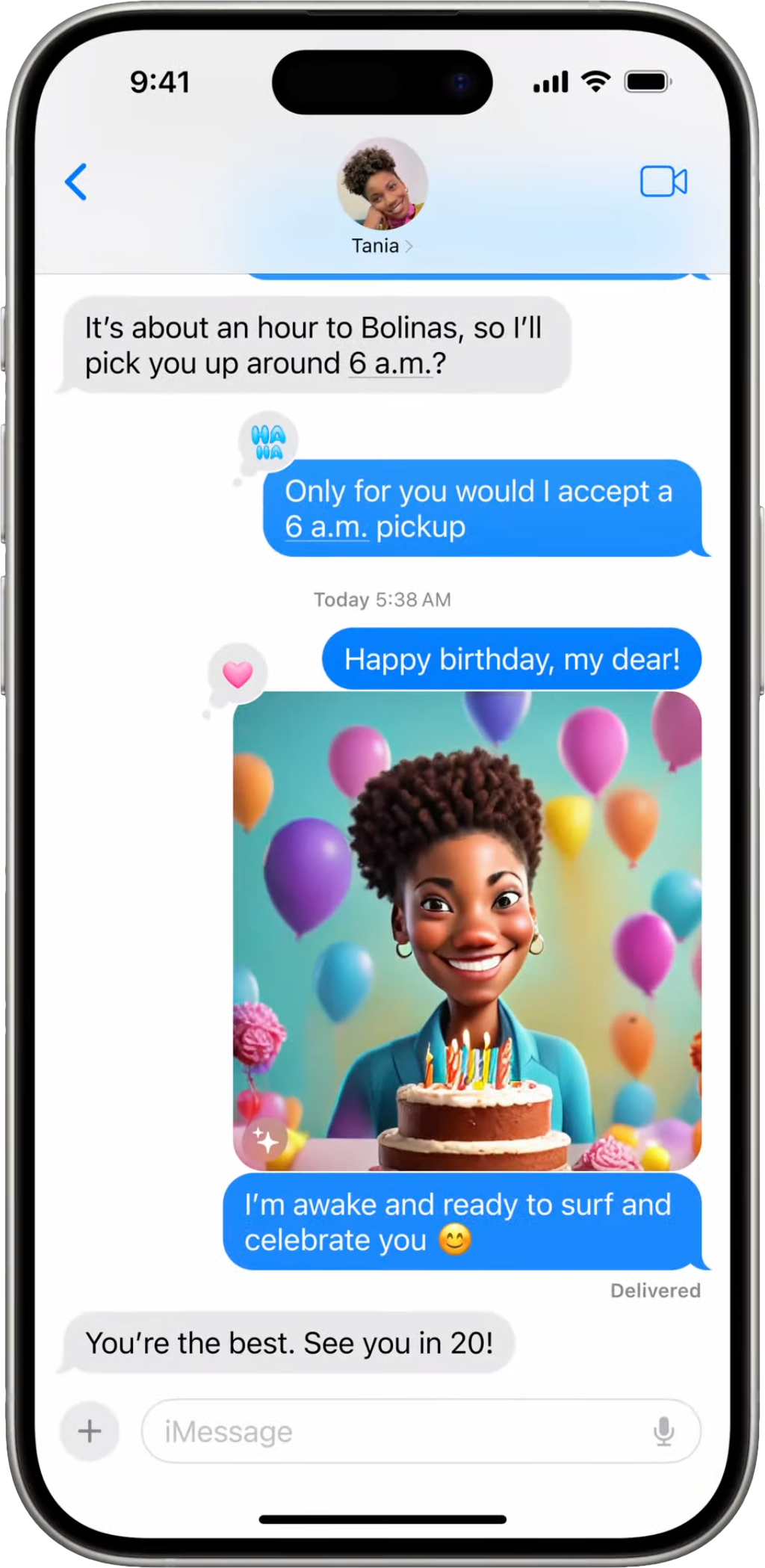 • Képek: Az Apple Intelligence új lehetőségeket kínál a képek létrehozására és a vizuális önkifejezésre. A felhasználó teljesen eredeti képeket hozhat létre, amelyekkel még szórakoztatóbbá teheti a barátokkal és a családdal folytatott csoportos csevegéseket, és mivel az Apple Intelligence felismeri a fotókönyvtárban szereplő személyeket, ezeket a képeket személyre is szabhatja.