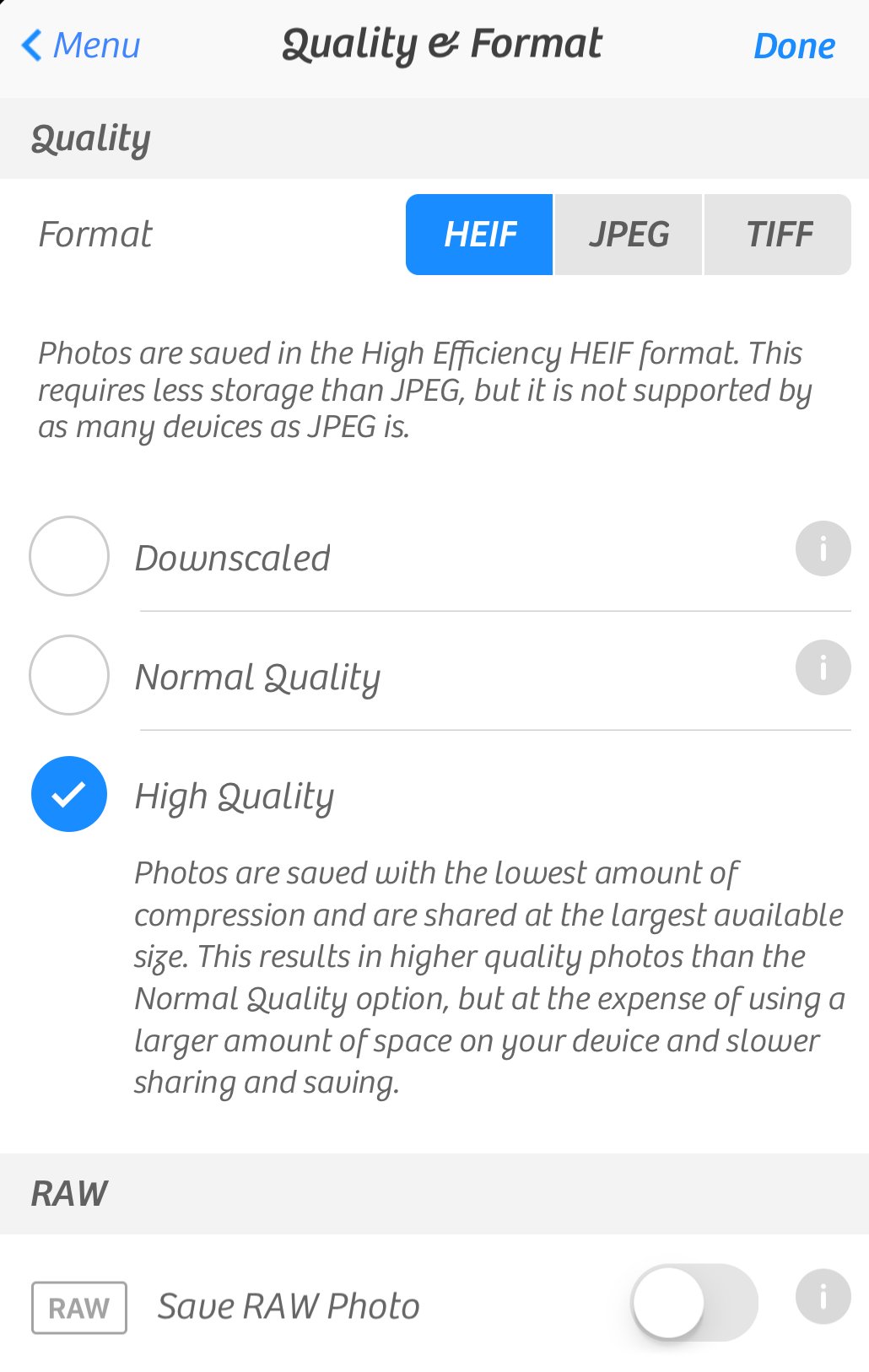 A Quality & Format felületen tudunk választani a különböző fájlformátumok között: a HEIF az Apple új, iOS 11-ben bemutatott tömörítése, amely sokkal hatékonyabb, mint a JPEG. Emellett választhatunk JPEG formátumot, amely nagyobb méretű, de szélesebb kompatibilitású, menthetjük a képeket TIFF formátumban, amely a kreatív programok számára ideálisabb formátum, továbbá elmenthetjük a RAW formátumot is, ha a leginkább a hardverre jellemző, szoftveres kezeléstől mentes végeredményt szeretnénk a későbbi szabadabb feldolgozásra megtartani.