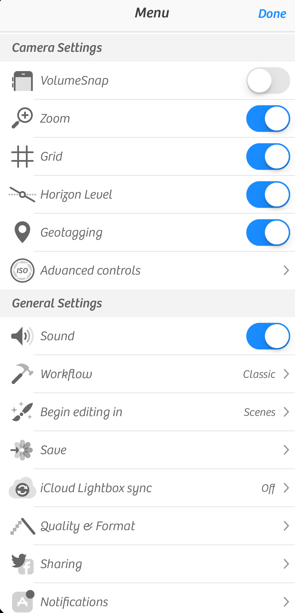 Az első kép elkészítése előtt érdemes átfutni a beállításokat, amelyek a jobb alsó sarokban érhetőek el a kis felsorolás ikonra bökve! Nagyon praktikus képesség a Horizon Level paraméterrel a vízszint kijelzése. Ez elképesztő mértékben tudja segíteni a jó képek készítését.