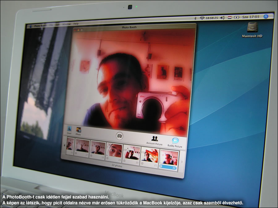 Bevallom, az első élményem nem teljesítményteszt vagy hasonló volt, hanem negyedóra "ökörködés" a PhotoBooth szoftverrel, ami a beépített kamerával készít egészen jó minőségű képeket. A beépített kamera hihetetlen kényelmessé teszi a videó csevegést. Korábban a mobil gép tulajdonosoknak rá kellett készülni a videókonferenciára, elővenni az iSightot, felrakni a gépre, és megvárni, amíg az iChat reagál rá. Most ez alapból adott, és nem kis többlet használati értéket ad a géphez, illetve nagyobb kedvet ad a videó alapú csevegéshez.