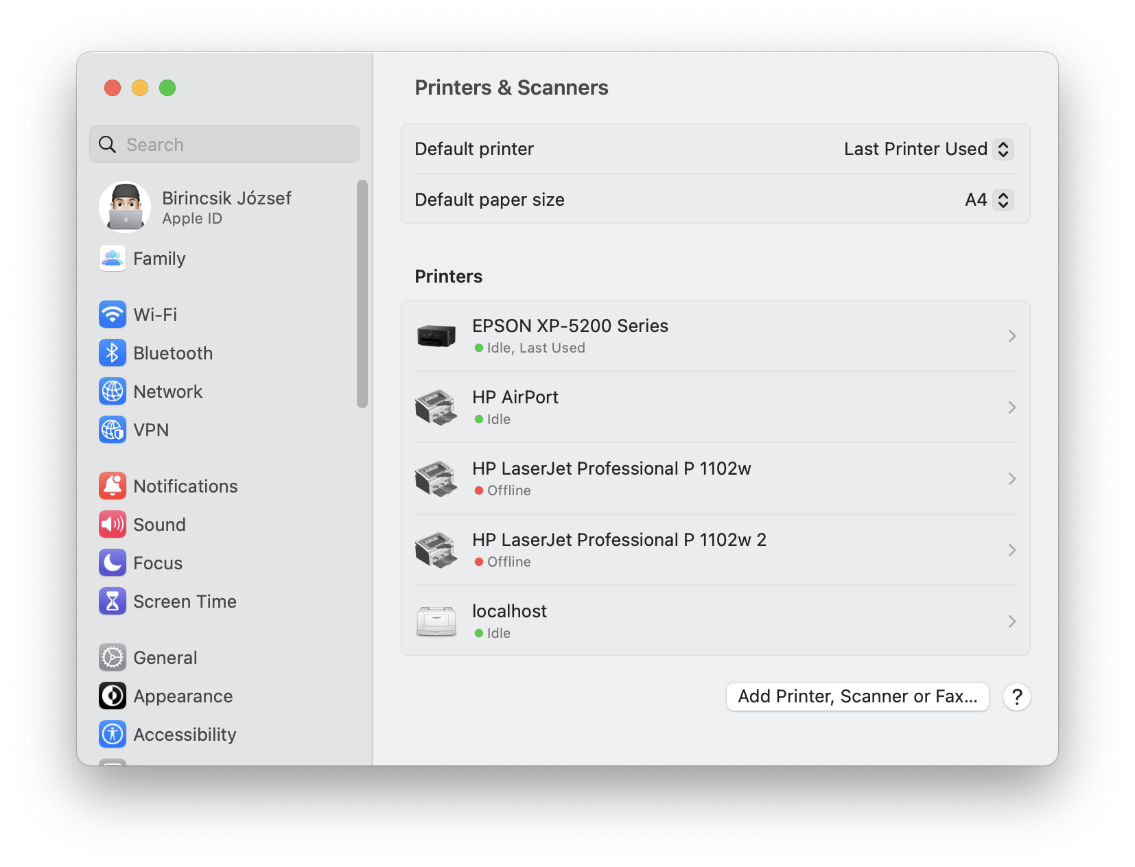 A nyomtatókkal kapcsolatos beállítási feladatkör a System Settings / Rendszerbeállítások program Printers & Scanners / Nyomtatók és szkennerek paneljén található. A panel tartalmazza az összes olyan nyomtatót és szkennert, amelyet a rendszerrel már használtunk, vagy amelyet hozzáadtunk a nyomtatólistához. Itt tudunk további nyomtatót hozzáadni a rendszerhez. Nyomtató a Mac olyan nyomtatóról tud, amely fel van véve erre a nyomtatólistára.