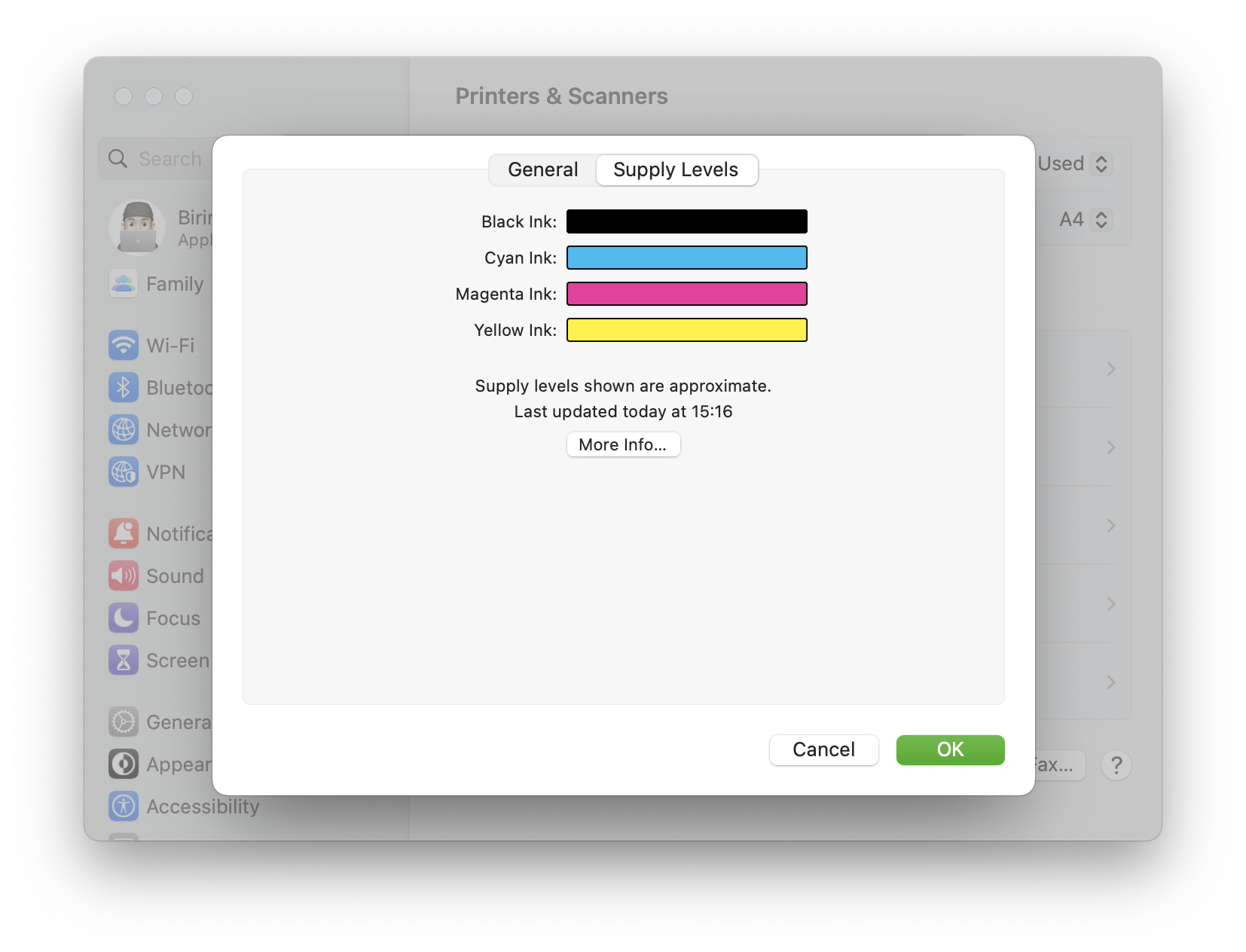 Ugyanitt az egyes nyomtatókkal kapcsolatos információkat is lehetőségünk van lekérdezni (Options & Supplies… / Beállítások & Készletek…): ilyen például a tintasugaras nyomtatók esetén a patronok állapota, amelyet a rendszer színekkel ábrázolva viszonylag pontosan kijelez. Itt meg tudjuk tekinteni a meghajtóprogramot, a nyomtató elérését, illetve hozzáférhetünk a nyomtató programjához, amely általában önellenőrző funkciókkal is el van látva, és ha rendellenes működést tapasztalunk, akkor kijelzi az esetleges hibákat.