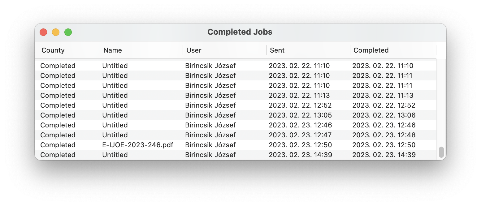 A macOS egyik zseniális vonása, hogy a már elküldött munkákat is át tudjuk küldeni másik nyomtató számára. Ha például rossz nyomtatóra küldtük ki a munkát, amely éppen nem elérhető, akkor a rendszer nem tudja kinyomtatni a fájlokat. A nyomtatási várólista ablakban megjelennek a feladatok. Ekkor csak ki kell választanunk egy olyan nyomtatót a System Settings / Rendszerbeállítások > Printers & Scanners / Nyomtatók és szkennerek panelen, amely éppen elérhető, duplán kattintani rajta, ezzel megnyitva az ő üres várólistáját. A nem elérhető nyomtató listájáról egyszerűen egérrel át tudjuk húzni a nyomtatási feladatot a másik, elérhető nyomtató listájára, és végre tudjuk hajtani a nyomtatási feladatot. (Ez különösen nagy előnye a Mac-nek például számlázáskor, hiszen nem veszik el a pótolhatatlan első példány.)