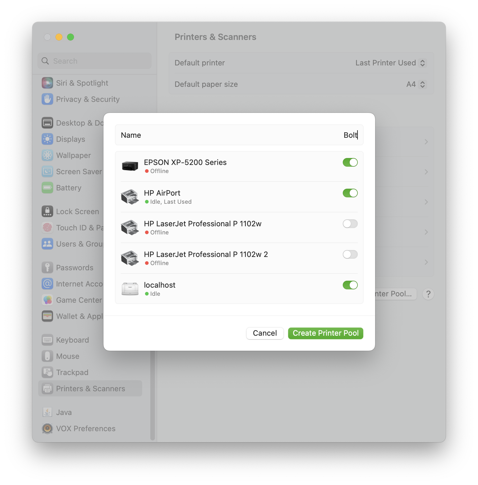 Az Option nyomva tartásával az Add Printer, Scanner or Fax… / Nyomtató, szkenner vagy fax hozzáadása… gomb Create Printer Pool… / Nyomtatókészlet létrehozása… paranccsá változik.