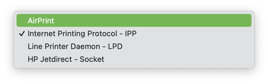 A hálózati nyomtatók szintén elérhetőek lehetnek AirPrint technológiával, mint nyomtatószerver, valamint Internet Printing Protocol (IPP) technológiával modernebb nyomtatószerverek és hálózati nyomtatók esetén, Line Printer Daemon (LPD) technológiával régebbi modellek esetén, és HP Jetdirect - Socket technológiával a Hewlett Packard egyes régebbi modelljei esetén. Ezeket a nyomtatókat IP-cím segítségével tudjuk elérni az Add Printer / Nyomtató hozzáadása párbeszédablakban a földgömb szimbólumra kattintva.