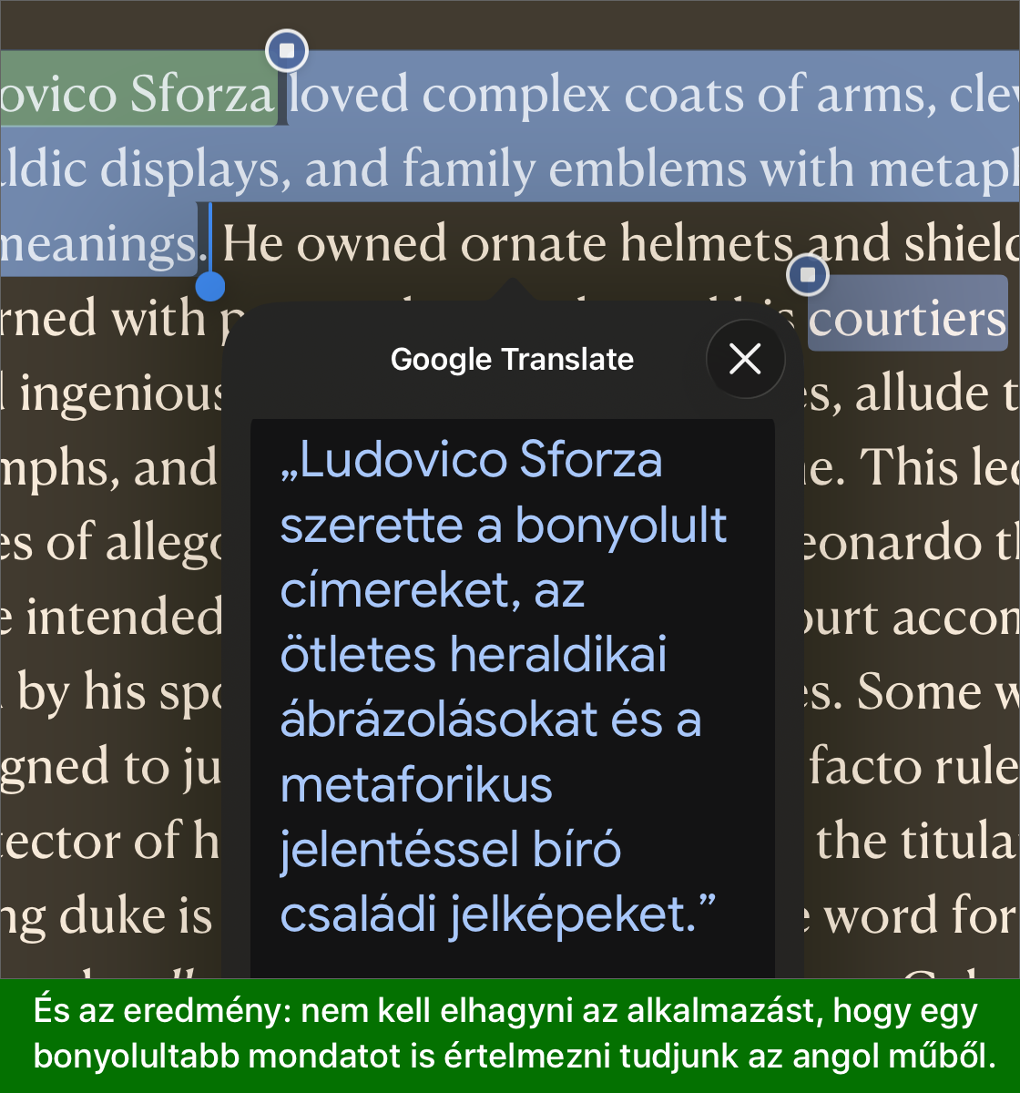 Az iPad készülékek kitűnő olvasásélményt nyújtanak, ám ha angol nyelvű irodalmat olvasunk, előfordulhat, hogy bizonyos szavakat, kifejezéseket szeretnénk dinamikusan lefordítani. Döbbenetes, de az Apple beépített fordító képessége nem csak élő beszéd formájában, de még karakteresen sem képes arra, hogy a Kárpát-medence nyelvét támogassa. A Google azonban az évek alatt a parodisztikus megfogalmazásait kinőtte, és mára egészen jól használható fordító megoldássá vált - szavak értelmezésére kiváló, de a mondatok terén is többnyire jól és még igényesen is fogalmaz.
