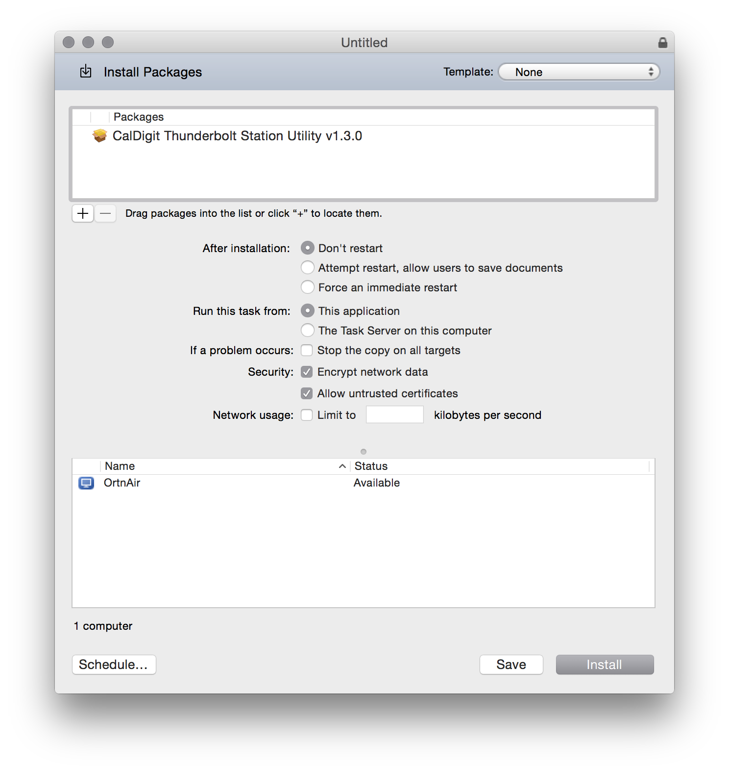 Az illusztráció során egy meghajtóprogram telepítését kell végrehajtani: a kliens gépeket kell alkalmassá tenni a CalDigital Thunderbolt Station 2 fogadására, és ehhez telepíteni szükséges a gyártó által biztosított meghajtóprogramot. A telepítés módja, hogy kiválasztjuk a klienst vagy klienseket, amelyeken a telepítést végre kívánjuk hajtani, és az eszköztár Install / Telepítés gombjára kattintva megjelenő ablak felső részén, a Packeges / Csomagok mezőben hozzáadjuk az adott telepítőt. Ez történhet egérrel behúzással vagy a plusz jelre kattintva történő hozzáadással. Fontos, hogy nem csak egy, hanem akár egyszerre több csomagot is telepíthetünk.
