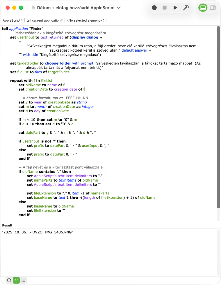 Fájlnév kiegészítő AppleScript alkotása a Script Editor / Szkriptszerkesztő felületén