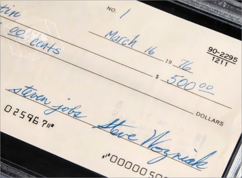 A csekken Steve Jobs és Steve Wozniak eredeti aláírása is látható, és a rajta lévő 500 dollárnál 4819-szer többért, 2.409.886 dollárért (több mint 800 millió forintért) cserélt gazdát.