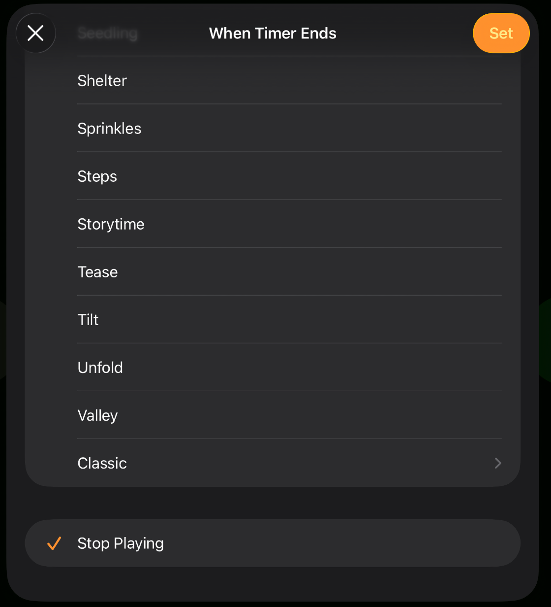 Ehhez a When Timer Ends / Amikor a visszaszámlálás letelik menüből az értesítő hangok közt legalulra kell görgetnünk, és a Stop Playing / Lejátszás megállítása elemet választani.