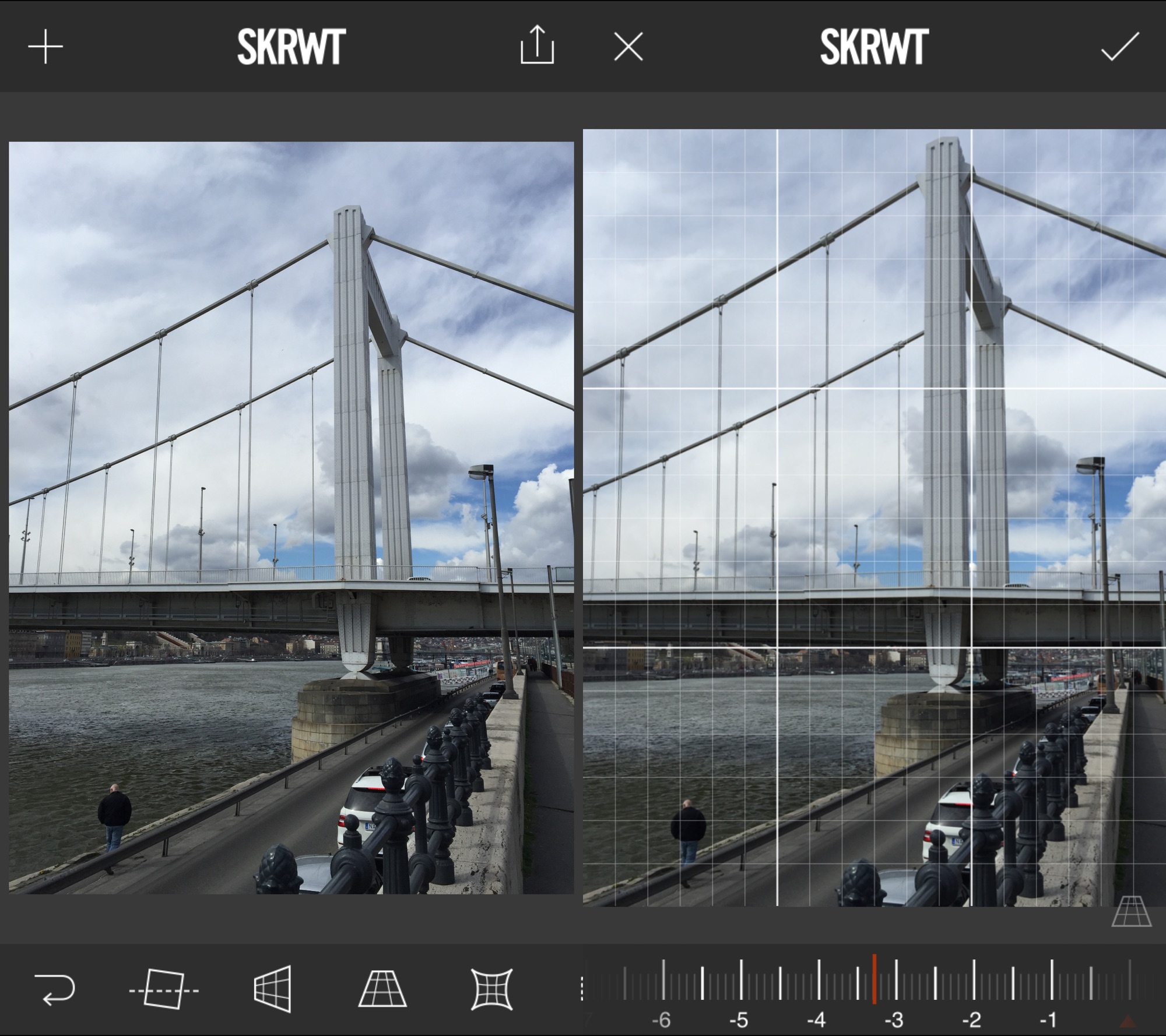 Aki valaha próbált már egy magas építményt lefényképezni, tapasztalhatta, hogy mi látszik a fotón: a perspektíva torzulása miatt az épület valamerre dől, és vízszint állítással nem orvosolható a probléma. Az iPhone készülékek esetén a látószög még nagyobb a szokásosnál, így a lencse több információt gyűjt, cserébe az említett dőlés sokszor még jobban érzékelhető. Erre a problémakörre kínál hatékony és könnyen használható megoldást az SKRWT alkalmazás az iPhone és iPod touch készülékekre.