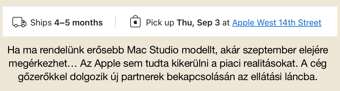 Az jól látható, hogy aki mostanság szeretne komolyabb Mac mini vagy Mac Studio modellt vásárolni, annak extrém hosszú időt kell várni. Az Apple szerencséje, hogy ezek a termékek már frissítésre érettek, vagyis a kereslet rájuk kisebb. Ugyanakkor a komponenshiány azt a problémakört is felveti, hogy érdemes-e bemutatni úgy egy M5 frissítést ezeknél a modelleknél, hogy a szállítási idő ősz lehet…