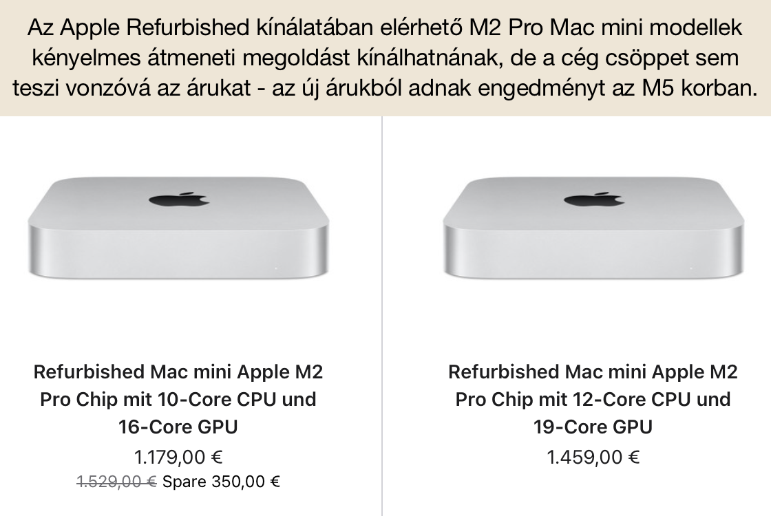 A helyzetet egyébként jól jellemzi, hogy a vásárlók nagy hatékonysággal csapnak le az Apple refurbished, azaz gyárilag felújított kínálatában előforduló jobb konfigurációkra. A svájci boltból teljesen elfogyott a Mac mini és a Mac Studio, míg az osztrák-német üzletben gyakorlatilag a megjelenés napján le is csapnak a vásárlók az M4/M4 Pro Mac mini modellekre, illetve az M4 Max / M3 Ultra Mac Studio példányokra. (Mac miniből is csak az M2/M2 Pro és Mac Studio modellekből is az M1 Ultra / M2 Max / M2 Ultra széria marad az Apple nyakán, de az a sajátos árpolitika miatt még a hiány mellett sem vonzó, hiszen az Apple az új árából képzi az akciós árat, és nem veszi figyelembe az eltelt 3-4 évet.)