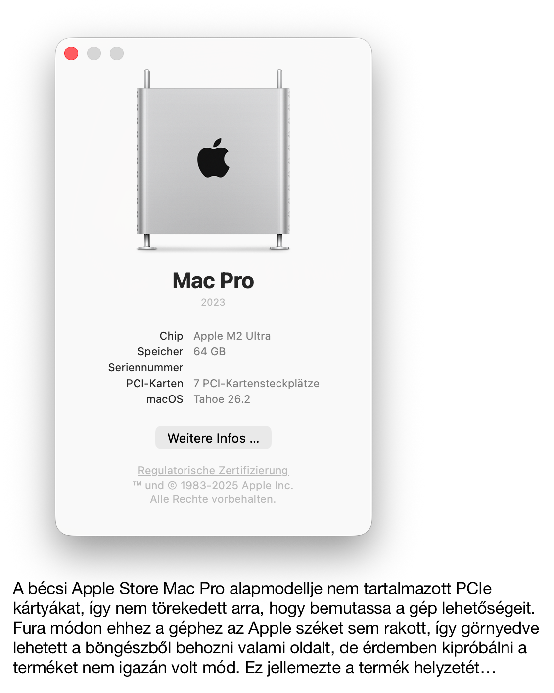 A Mac Pro 2019-ben újult meg egy igazi erőgép formájában még Intel processzorokkal. Aztán 2023-ban - jelentősen megkésve megjelent az M2 Ultra processzorral szerelt Apple Silicon utód. Míg minden más gépnél az Apple saját processzorára váltás árcsökkenést eredményezett - hiszen az Apple Silicon eleve olcsóbb volt, mint akár a korábbi Intel, akár a Samsung CPU-k -, a Mac Pro esetén váratlan 2000 dolláros áremelkedés történt - mindez úgy, hogy a gépből kimaradt a 700-900.000 Ft-os videókártya is… Az Apple tehát a Mac Studio fölé pozicionálta a vele teljesen azonos hardvert tartalmazó toronygépet, amelynek annyi extrája volt, hogy PCI Express kártyákat volt képes befogadni, és valamivel több csatlakozóval rendelkezett.