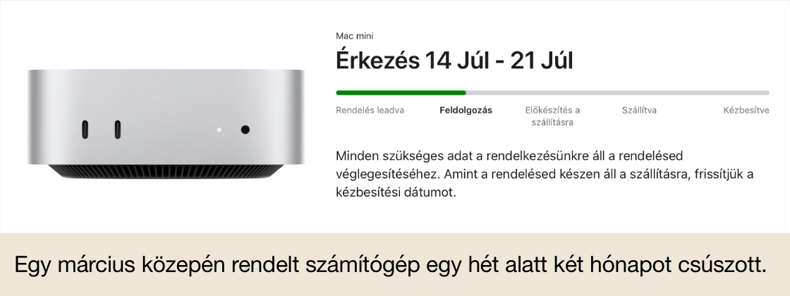 Az jól látható, hogy aki mostanság szeretne komolyabb Mac mini vagy Mac Studio modellt vásárolni, annak extrém hosszú időt kell várni. Az Apple szerencséje, hogy ezek a termékek már frissítésre érettek, vagyis a kereslet rájuk kisebb. Ugyanakkor a komponenshiány azt a problémakört is felveti, hogy érdemes-e bemutatni úgy egy M5 frissítést ezeknél a modelleknél, hogy a szállítási idő ősz lehet…