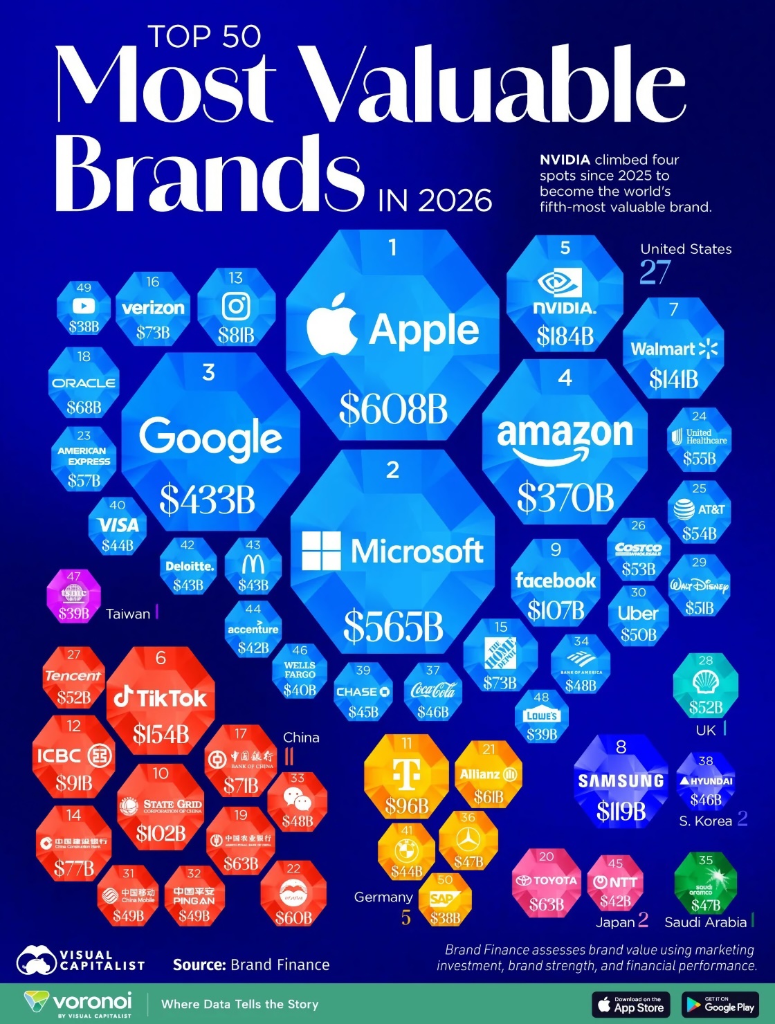 A Visual Capitalist szerint az Apple márka 608 milliárd dollárt ér, a Microsoft 565 milliárd dollárt, a harmadik helyen lévő Google márka (az Alphabet cég tulajdona) 433 milliárd dollárt, az Amazon 370 milliárdot, míg az NVIDIA 184 milliárdot. (Meg kell jegyezni, hogy számos almárka külön súlyozással szerepel a listán, például a szintén Alphabet tulajdonú YouTube önmaga 38 milliárd dolláros márka értéket hordoz. A Facebook és az Instagram is külön érték, noha mindkettő a Meta tulajdona, és együtt már az ötödik helyre kapaszkodnának fel - megerősítve a virtuális termékek kínálta márka értéket.)