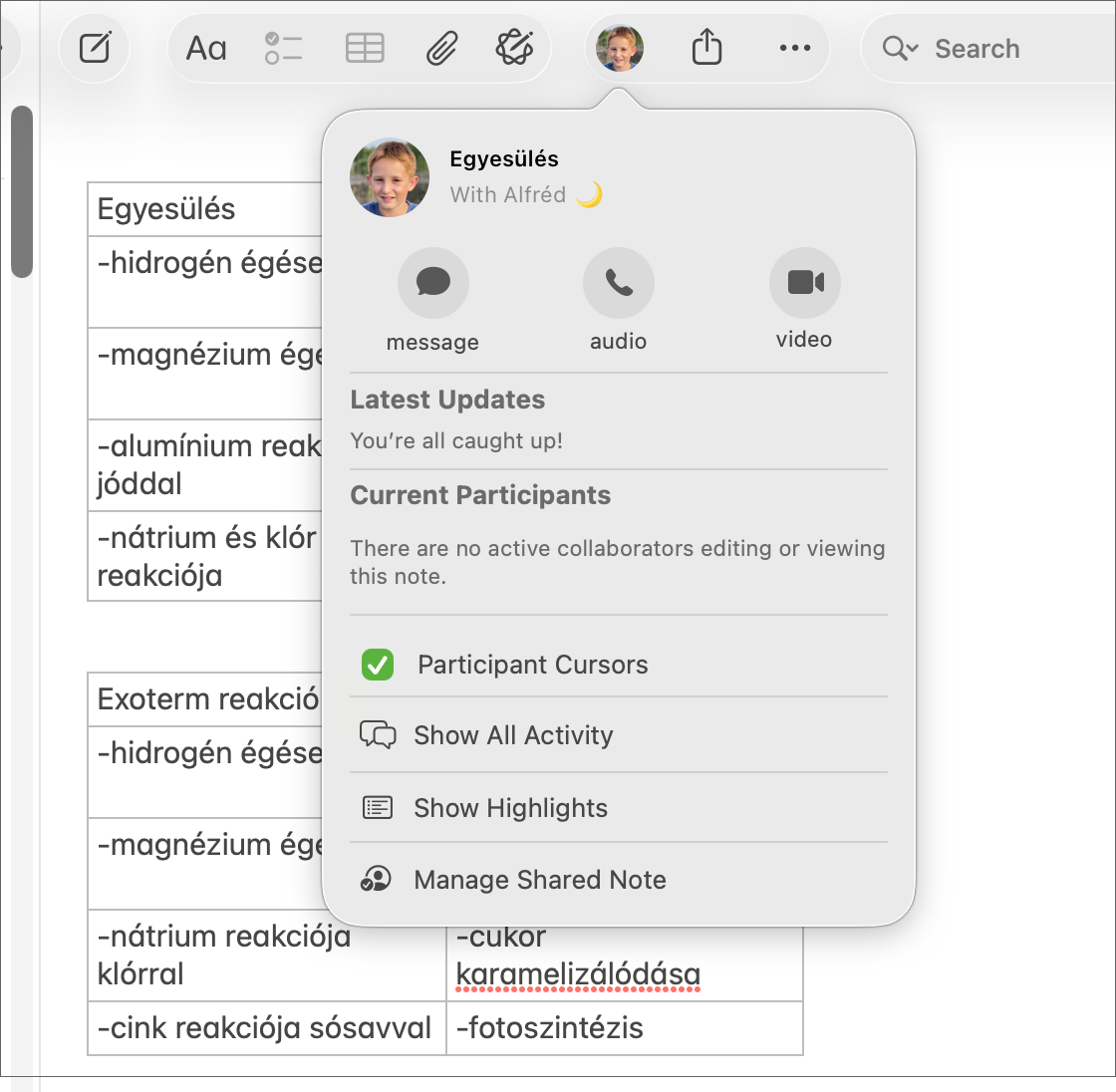 Az együttműködő szerkesztés során lehetőség van a Notes / Jegyzetek ablakának jobb oldalán átlátni, hogy ki és mit módosított a dokumentumban, valamint egy-egy szerkesztésnél az @ jelzéssel megszólítani valakit, felhívni a figyelmét egy módosításra, vagy javasolni valamilyen változtatást anélkül, hogy magát az iratot megváltoztatnánk. Ehhez a sziluettel jelölt gombra kell kattintani az eszköztárban, és ott mód van arra, hogy akár a résztvevő kurzor mozgását is láthassuk a Mac esetén. Mind a Mac-en, mind az iPadOS rendszeren láthatjuk az aktivitást (Show Activity), illetve a szerkesztés idővonalát (Show Highlights).